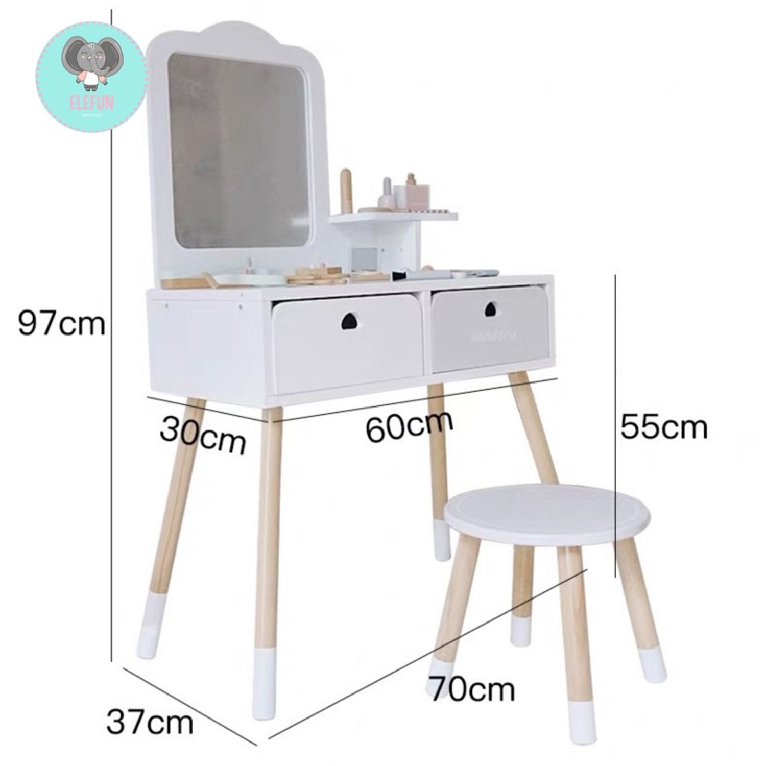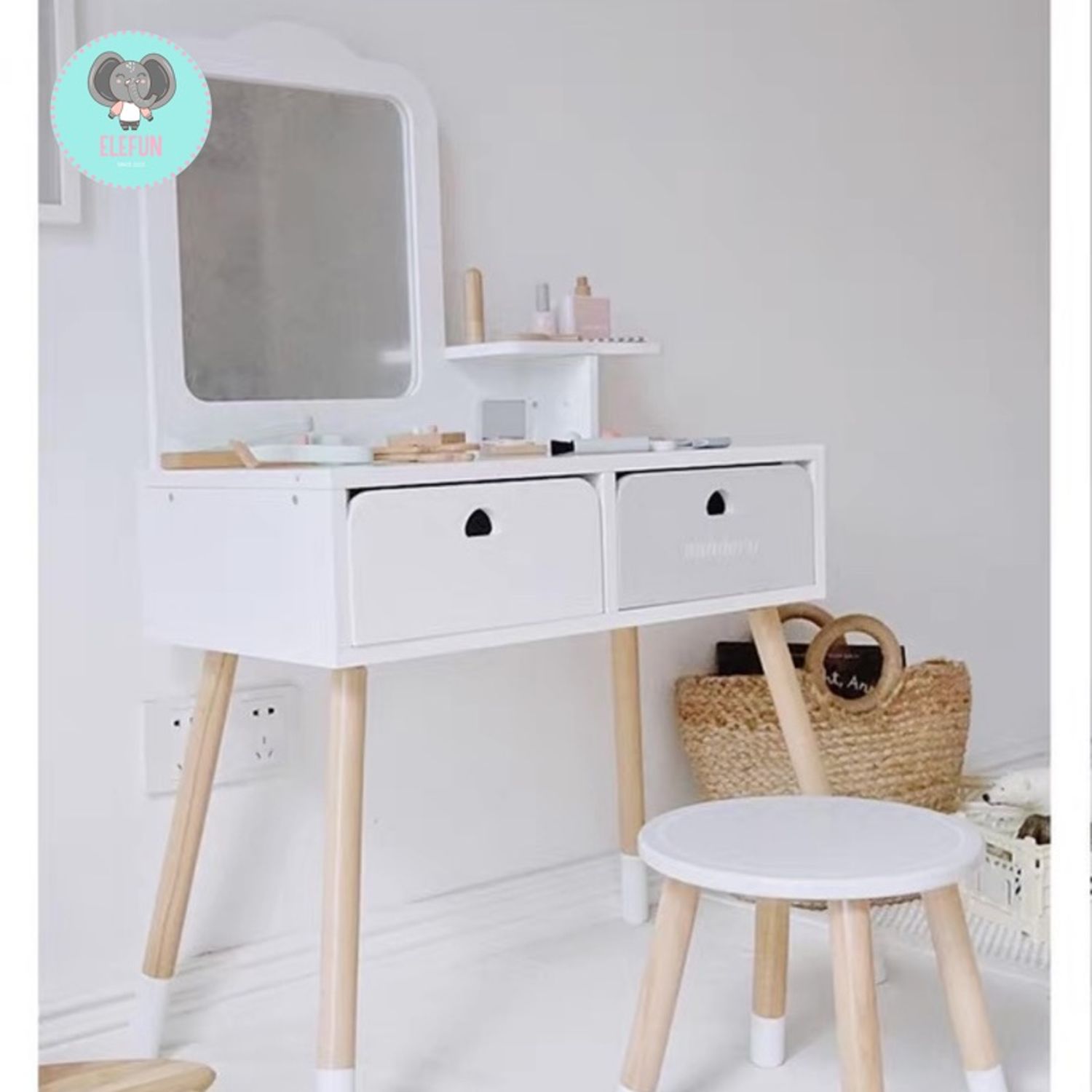 Охидын дуртай, өхөөрдөм загвартай хүүхдийн модон гоо сайхны ширээ. Толь, жижиг хэрэгслүүдтэй энэхүү сет нь хүүхдийг дүрд орж тоглох, өөртөө итгэх итгэлээ нэмэх, төсөөлөн бодох чадвараа хөгжүүлэхэд тусална.